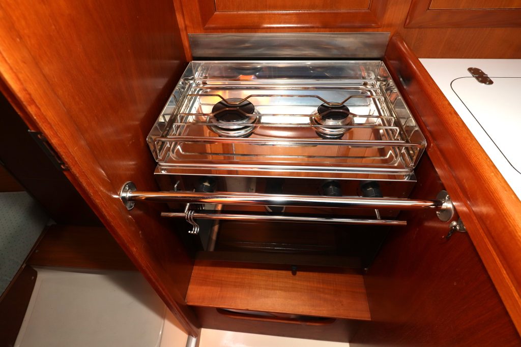 Från sittbrunnen finns en nedgång till salongen, där det finns soffor på båda sidor. På babord sida finns ett pentry med spis och kompressorkylskåp.