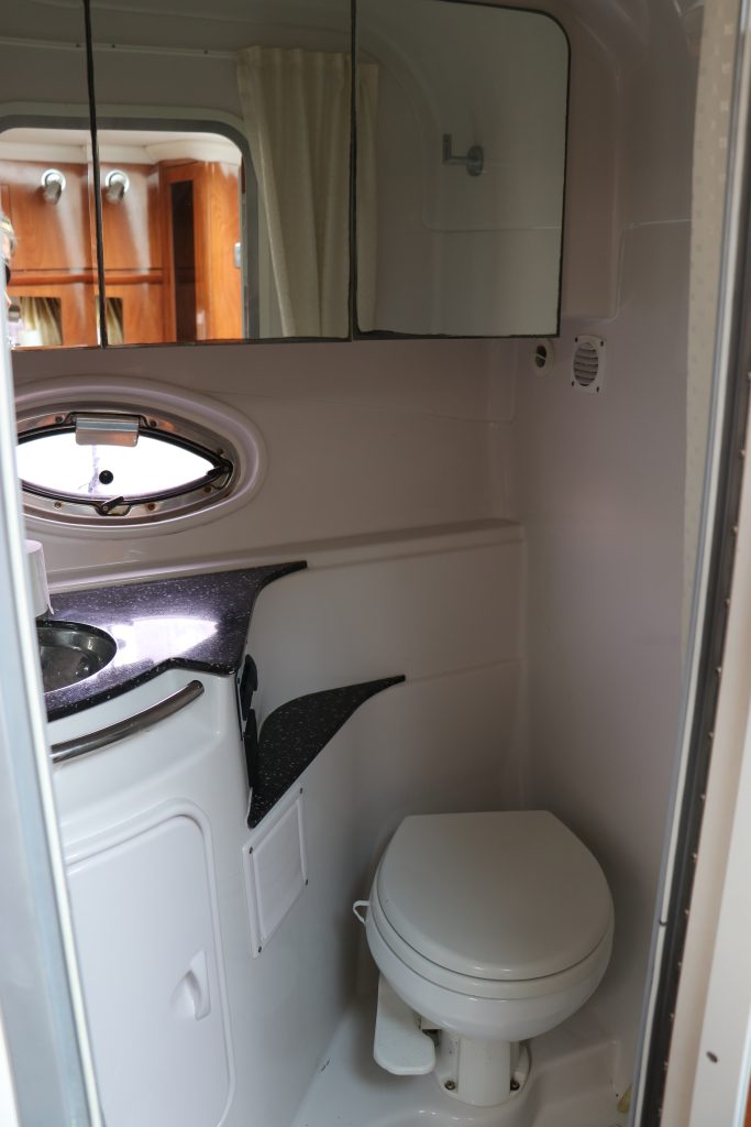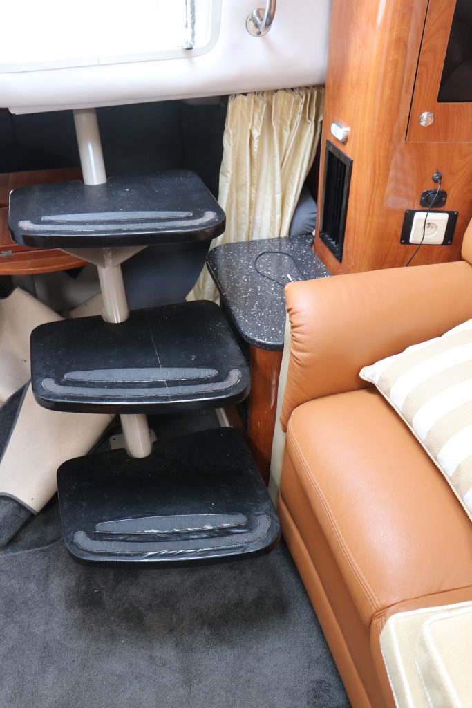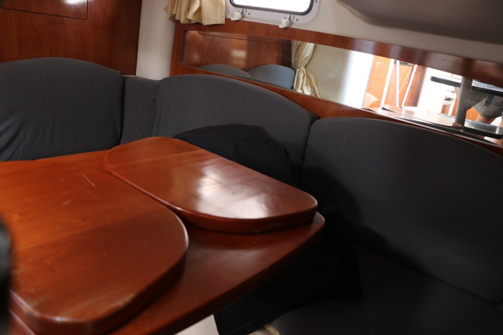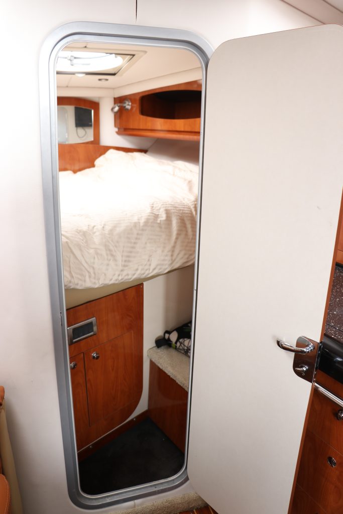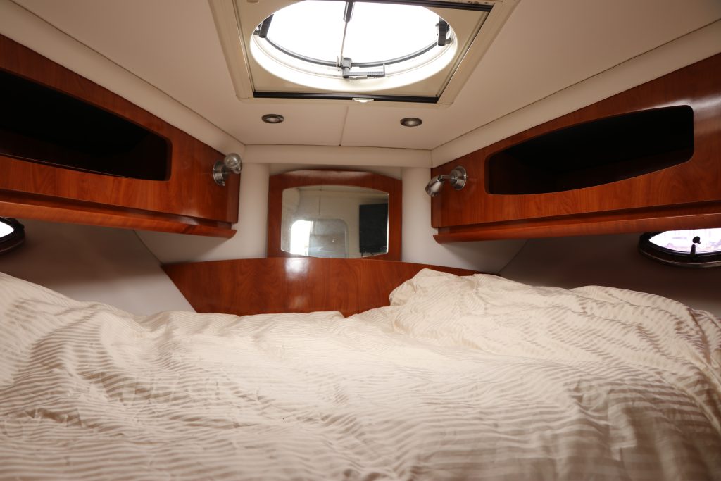 Den främre stora masterkojen har enkel åtkomst och kompletteras med djup lådförvaring runt och under kojen. När det är dags kan en matbordsskiva och dess piedestal sättas upp.