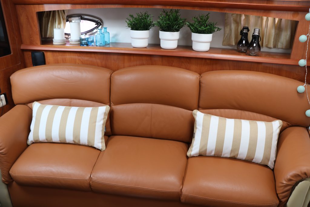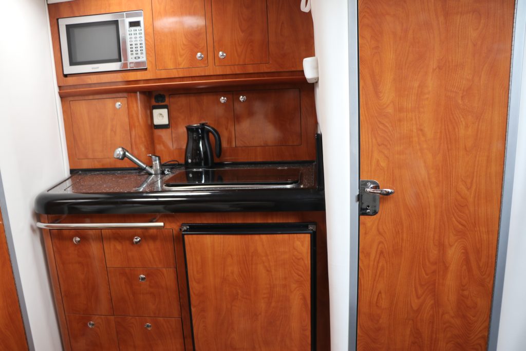 Om prestation är ett av huvudkorten som Four Winns 318 spelar, är hans mycket fina hytt med varmt trä, stor läderbäddsoffa och rosetthytt också mycket inbjudande. Köket har en glasfiberbänk och en vit ram och polerad insats ser bra ut tillsammans.